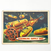 1957 Topps Space Card #54 Assembling Supply Ship Chewing Gum Moon Cartoon Art
